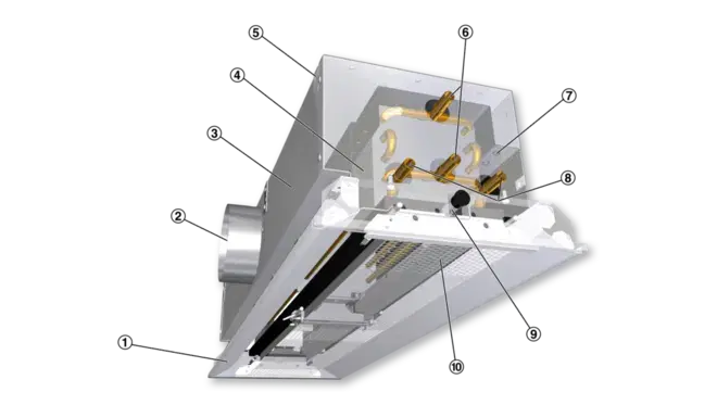 Den primære luft strømmer gennem dyser ind i blandekamrene; som følge heraf induceres sekundær luft (rumluft) gennem induktionsgitteret og passerer gennem varmeveksleren.