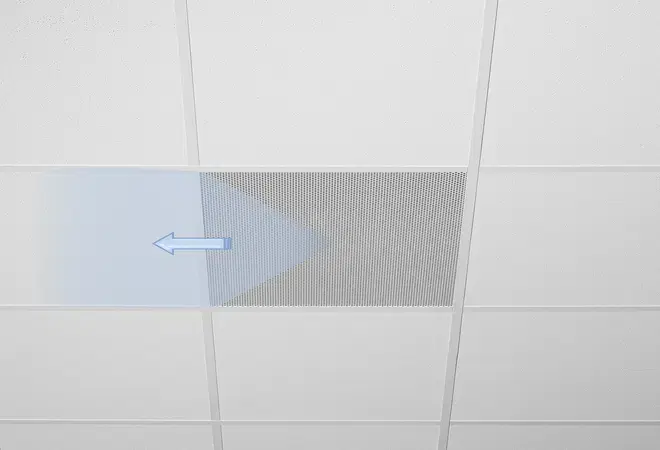 Loftdiffusorer med perforeret firkantet front. Til- og fraluftsvarianter til komfortzoner. Diffusorfront med baffelelement til horisontal envejs til firevejs udblæsning af tilluft. Til montage som flugter med loftet; i alle former for nedhængte gitterlofter eller gennemgående gipsplader.