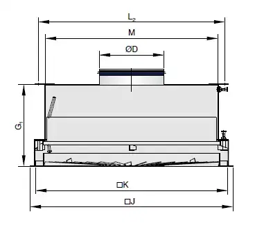 ① Nominel størrelse ② Filterstørrelse ③ Studsens diameter ④ Kabinettets højde ⑤ Enhedens overordnede dimensioner ⑥ Kabinettets overordnede dimensioner ⑦ Kabinet flangens overordnede dimensioner ⑧ Ophæng i toppen, afstand mellem skruehuller ⑨ ~ Vægt