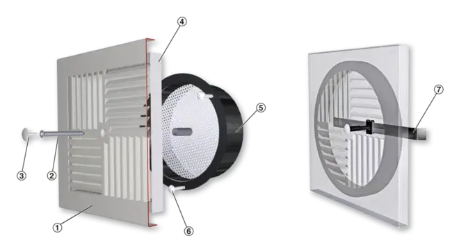 Komponent, der er klar til installation, og som består af en armaturfront med faste luftreguleringslameller arrangeret i kvadranter.