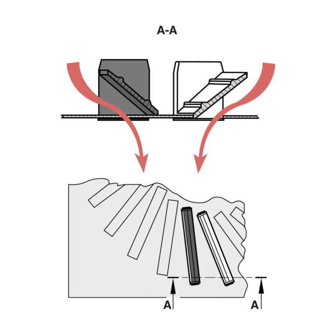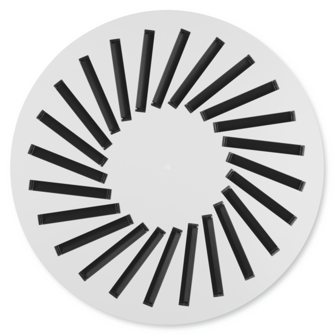 Klar til montering, bestående af en frontdiffusor med radialt placerede, individuelt justerbare, sorte eller hvide luftreguleringslameller og af en tilslutningsboks, et udligningselement (kun varianter med tilluft), en side- eller topindgang, en tværstang og ophængshuller eller ophængningsøjer.