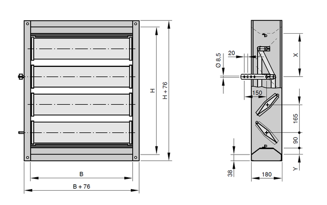 Rectangular multileaf dampers for volume flow and pressure control as well as for low-leakage shut-off of ducts and openings in walls and ceiling slabs. Ready-to-operate unit which consists of the casing, aerofoil blades and the blade mechanism. Flanges on both sides, suitable for duct connection. The blade position is indicated externally by a notch in the blade shaft extension.