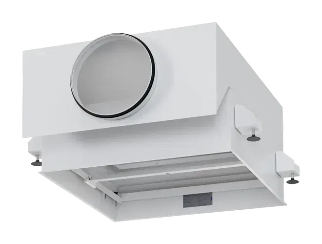 Kabinet med cirkulær studs med side- eller toptilslutning eller med rektangulær studs med sidetilslutning. Loftmonterede partikelfiltre med cirkulær studs er som standard udstyret med en læbetætning. Vælg mellem forskellige konstruktioner: lufttæt afspærringsspjæld med lav lækage, enten manuelt justerbart eller med elektrisk aktuator; volumenstrømsbegrænser; spjældblad til balancering af volumenstrøm; forsænket sidetilslutningsstuds; eller aerosoltilførsel. Kabinet uden testrille til filtre med flad forsegling, kontinuerlig skumforsegling eller gelforsegling; kabinet med testrille som ekstraudstyr til filtre med flad forsegling.