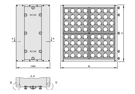 Nominel størrelse | Antal monteringsplader/cellerammer | Antal patroner | Antal filterelementer | ∼ Vægt [kg] | ||||||