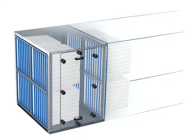 Filterelementer skal bestilles separat. I tilfælde af større volumenstrømme kombineres 2 enheder side om side. Placering af vedligeholdelsesdæksler til filterskift til højre og venstre. Alle vægte er netto, uden emballage.