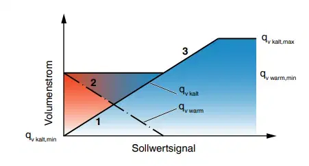 Den varme/overordnede controller er indstillet til den mindste volumenstrøm qᵥmin og styrer spjældbladet i varmekanalen.