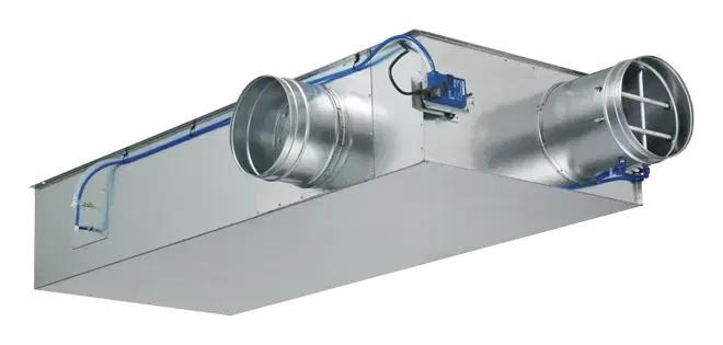 Driftsklar enhed, som består af de mekaniske dele og de elektroniske kontrolkomponenter. Hver enhed indeholder to effektive tryksensorer til måling af volumenstrøm, en i den kolde luftstrøm og en i den samlede luftstrøm, to spjældblade og en integreret lyddæmper. Fabriksmonterede kontrolkomponenter komplet med ledninger og slanger. Effektiv tryksensor med 3 mm målehuller, derfor modstandsdygtig over for forurening. Studs på ventilatorenden med rille til dobbelt læbetætning, egnet til kanaler i henhold til EN 1506 eller EN 13180.