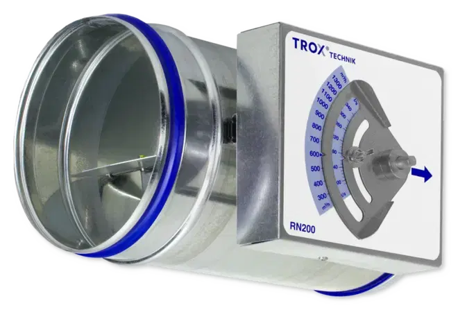 Volumenstrømmens sætpunktsværdi kan indstilles hurtigt og nemt ved hjælp af viseren på den udvendige skala; der kræves ingen målinger.